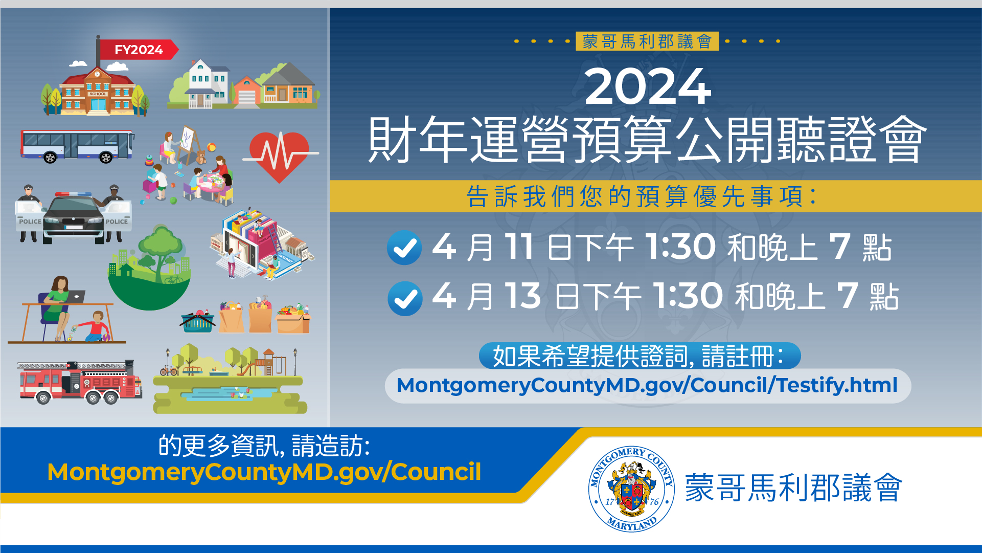 我鼓勵居民參加即將於 4 月 11 日下午 1:30 和晚上 7 點以及 4 月 13 日下午 1:30 和晚上 7 點舉行的公開聽證會。會議將以線上虛擬和當面方式舉行。如果您無法參加我們的現場聽證會,您也可以提交書面、錄像或錄音證詞。如果希望提供證詞,請註冊:montgomerycountymd.gov/Council/Testify.html。