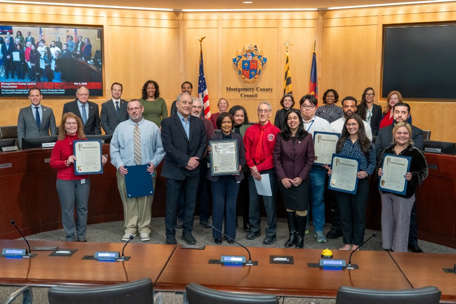 On March 3, 2026, Council President Natali Fani-González presents a proclamation with County Executive Marc Elrich, recognizing National Consumer Protection Week. Photo by Benjamin Sky Brandt for the Montgomery County Council.