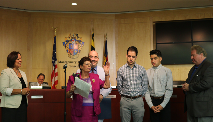 Rachel Robinson, who is believed to be the longest continuous teacher of Hebrew classes in Montgomery County, was honored by the Montgomery County Council on June 21 as she prepares to retire from her regular workload of the past 45 years that included teaching first, third, sixth and seventh graders at Temple Sinai, Washington Hebrew Congregation, Kehillah and Temple Shalom. Those at the ceremonies in Rockville included County Councilmembers Nancy Navarro and George Leventhal; Councilmember Leventhal’s sons Daniel and Francisco, each of whom was a student of Mrs. Robinson; and Rabbi Michael Feshbach of Temple Shalom.