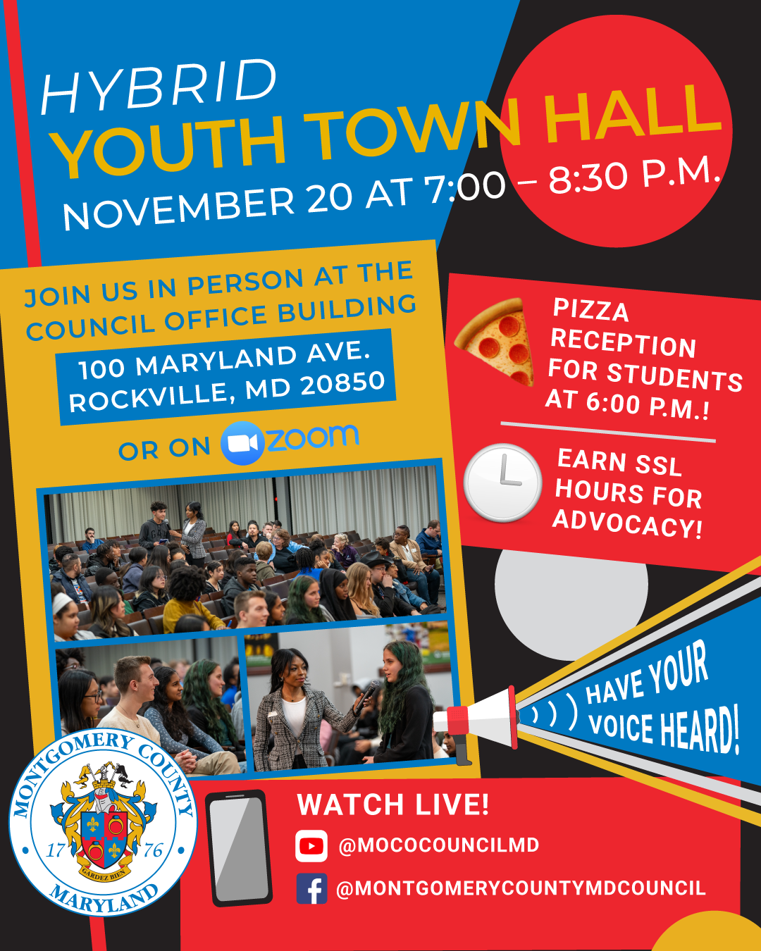 ROCKVILLE, Md., Oct. 25, 2024—The Montgomery County Council will host a Youth Town Hall meeting on Wednesday, Nov. 20 at 7 p.m. at the Council Office Building in Rockville. This annual meeting with students promotes youth engagement in community and public policy issues and allows Councilmembers to hear directly from young people about their concerns and views.
