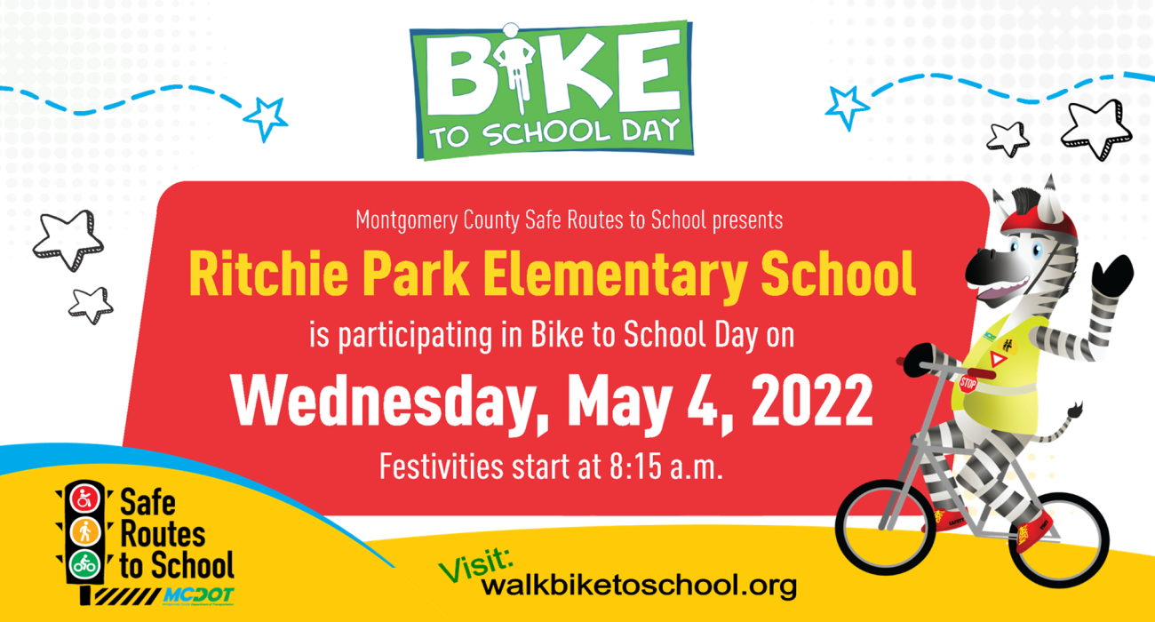 Montgomery County will join the celebration of the annual Bike to School Day on Wednesday, May 4, with a fun-filled event from 8:15-9:15 a.m. at Ritchie Park Elementary School in Rockville. Elected officials and representatives of the County’s Department of Transportation (MCDOT) and Vision Zero programs will be among those distributing safety materials and greeting students and parents to encourage biking to school.