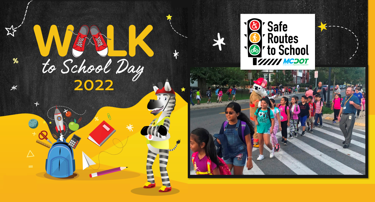 The Montgomery County Department of Transportation (MCDOT) Safe Routes to School (SRTS) program, which encourages students who have a safe path and live near their elementary school to walk to school, will join in the national recognition of “Walk to School Day” on Wednesday, Oct. 12. Most County elementary schools will participate, with a special event starting at 8:30 a.m. that day being held at Wheaton Woods Elementary School in Rockville.