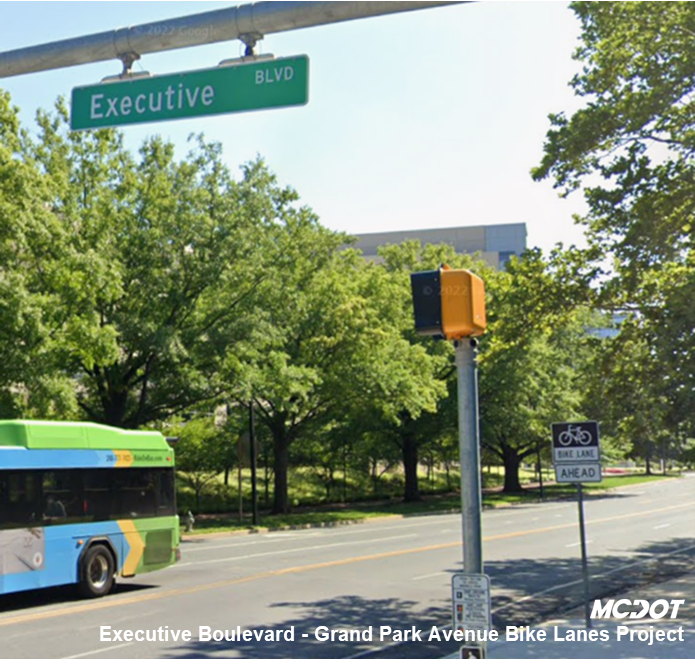 This project proposes constructing separated bike lanes along Executive Boulevard and Grand Park Avenue in North Bethesda. The proposed bike lanes will run along Executive Boulevard from Nicholson Lane to Marinelli Road and then continue along Grand Park Avenue from Marinelli Road to Old Georgetown Road.