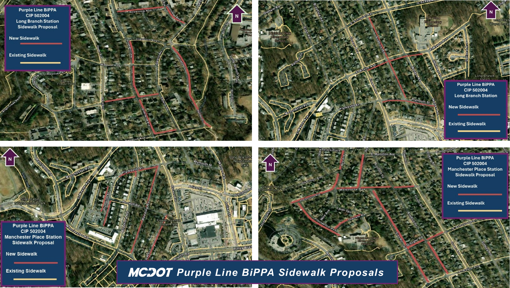 The Purple Line BiPPA Sidewalk Proposals for the Long Branch and Manchester Place Stations project proposes the installation of 5-foot-wide concrete sidewalks on roadways within a half-mile radius of each new Purple Line station. In addition to new sidewalks, MCDOT will also add crosswalks, curb ramps, and other pedestrian amenities to make it safer and easier for residents to navigate the area around the new Purple Line stations.