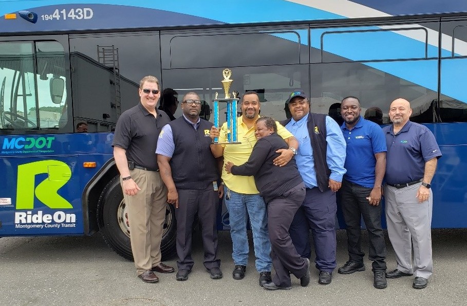 MCDOT Ride On Bus Operator Murid Omid took first place in the annual Montgomery County Ride On Bus “Roadeo” held on Saturday, September 14 in Gaithersburg. He and his daughter posed with MCDOT leaders after the event with the winning trophy.