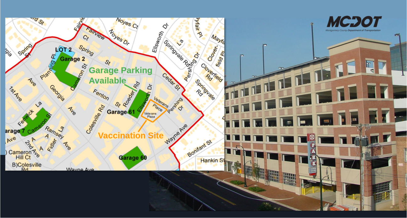 For those getting vaccinated for COVID-19 at the Silver Spring Civic Building, the Montgomery County Department of Transportation (MCDOT) provides free parking at Town Square Parking Garage 61, located at 801 Ellsworth Drive in Silver Spring.