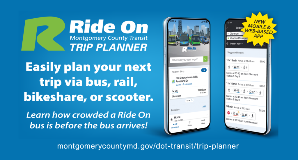 The new Ride On Trip Planner app allows for trip planning across multiple modes including Ride On buses, Metrorail and Metrobuses, scooters and Bikeshare. Additionally, the app will give live reports on wait times and ridership levels for Ride On buses by utilizing a crowdsourcing information feature.