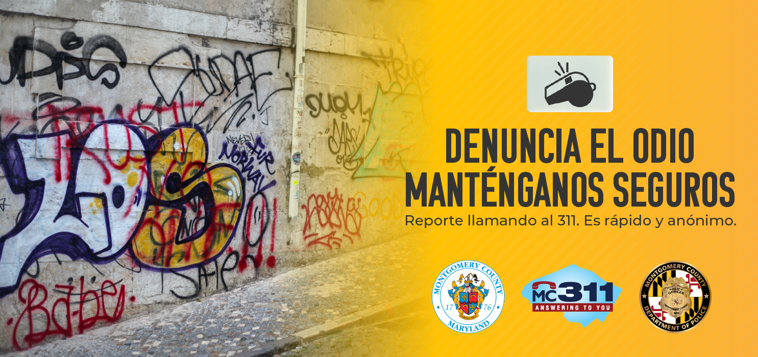 Para denunciar un incidente de odio o prejuicio que no sea una emergencia, llame al 311 o complete el formulario en línea en www.montgomerycountymd.gov/report-hate. Para denunciar un delito, llame al 301-279-8000. Para denunciar una emergencia, llame al 911.