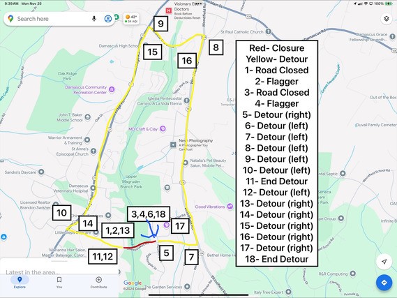 Beginning Wednesday, March 19, Sweepstakes Road in Damascus will experience closures, lane shifts, and temporary detours due to construction. The project is scheduled to take 3-5 days to complete, weather permitting. Work hours will be between 7 a.m. and 5 p.m., Monday through Friday.