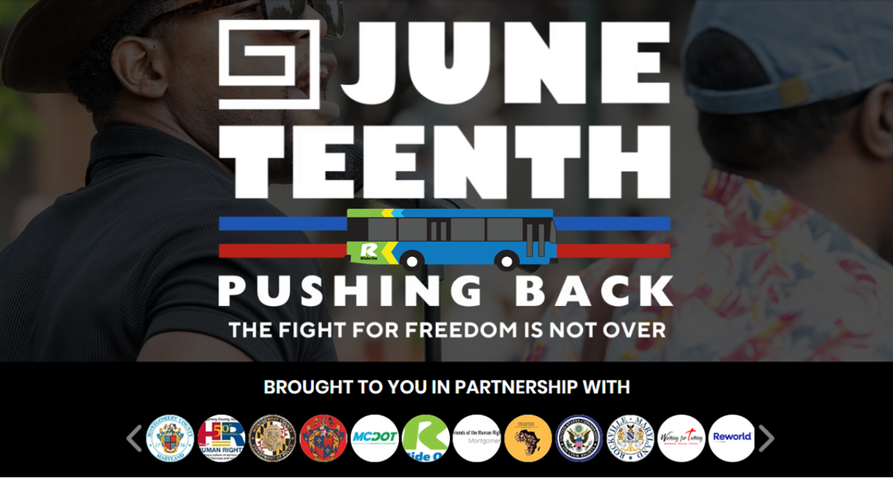 On Saturday, June 21, Ride On will provide shuttle bus service for the "Juneteenth: Pushing Back—The Fight for Freedom is Not Over" free, public event at the BlackRock Center for the Arts located at 12901 Town Commons Drive in Germantown.