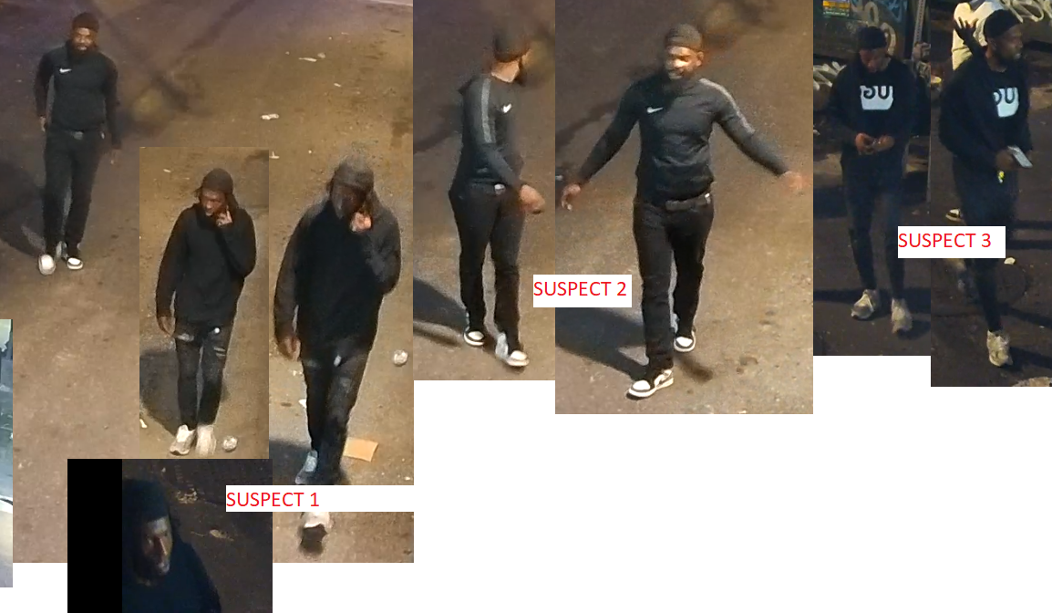 The suspects are described as three Black males, approximately 20 to 30-years-old, wearing dark clothing. One suspect had shoulder length hair that he wore in braids or twists. The other two suspects had short hair.