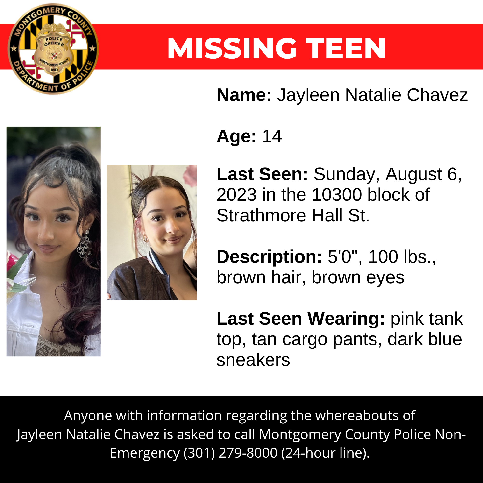 Gaithersburg, MD - The Special Victims Investigations Division is asking for the public's assistance in locating, Jayleen Natalie Chavez, a missing 14-year-old.