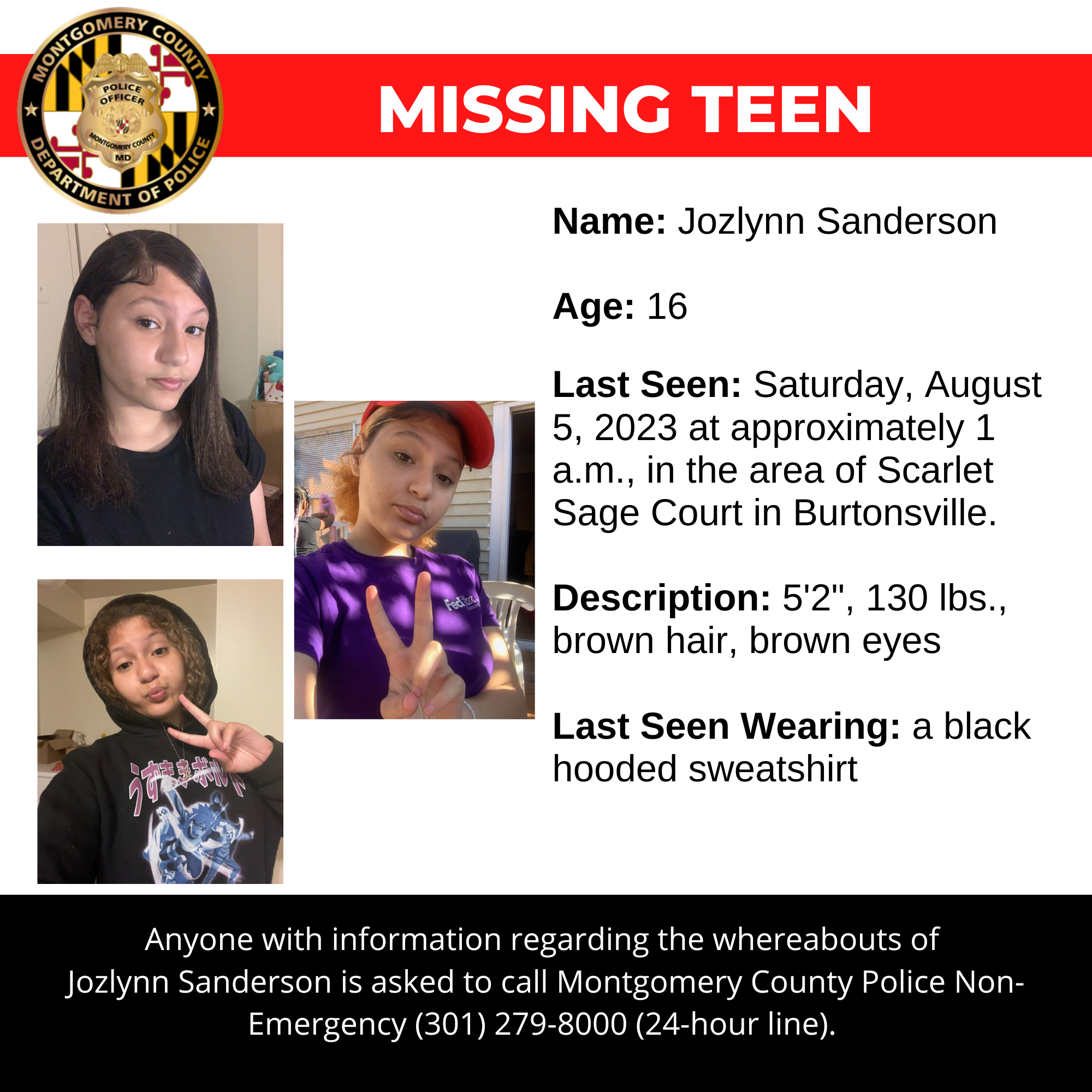 Gaithersburg, MD - The Special Victims Investigations Division is asking for the public's assistance in locating, Jozlynn Sanderson, a missing 16-year-old from Burtonsville.