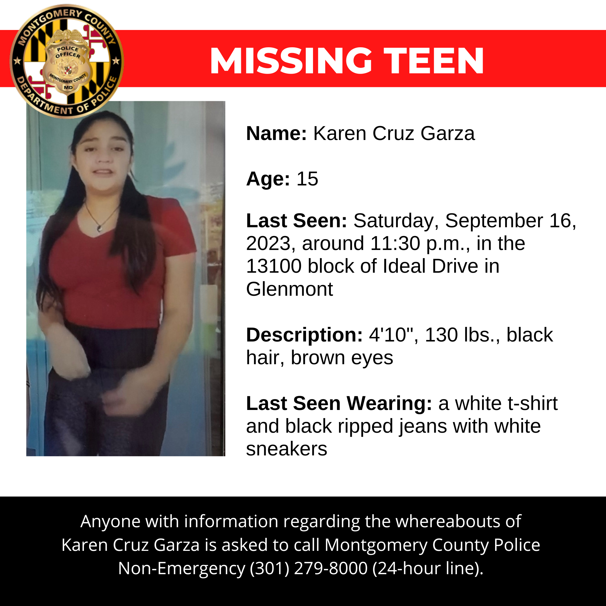 Gaithersburg, MD - Detectives from the Montgomery County Department of Police - Special Victims Investigations Division (SVID) are asking for the public's assistance in locating Karen Cruz Garza, a missing 15-year-old.