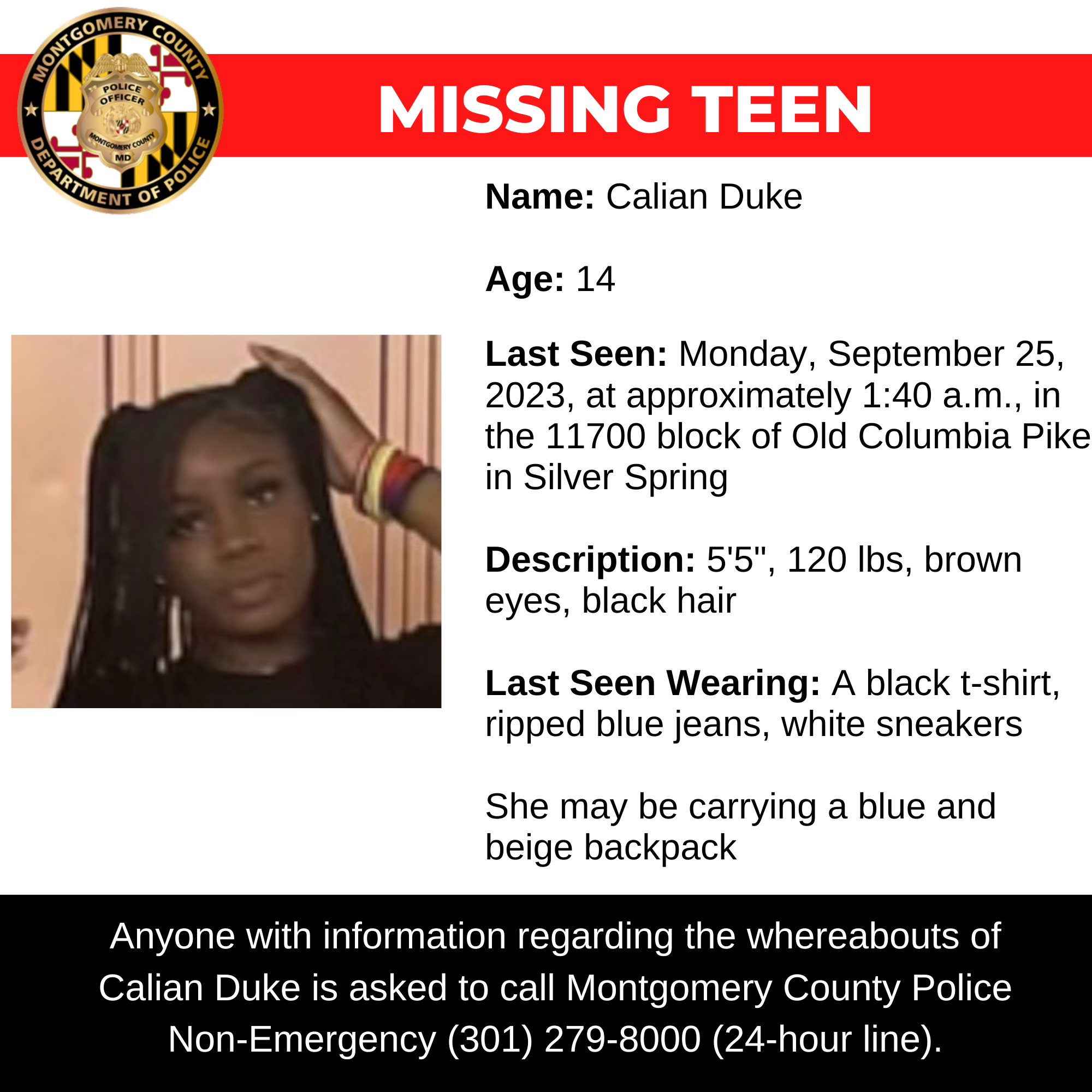 Gaithersburg, MD - The Special Victims Investigations Division (SVID) is asking for the public's assistance in locating Calian Duke, a missing 14-year-old.