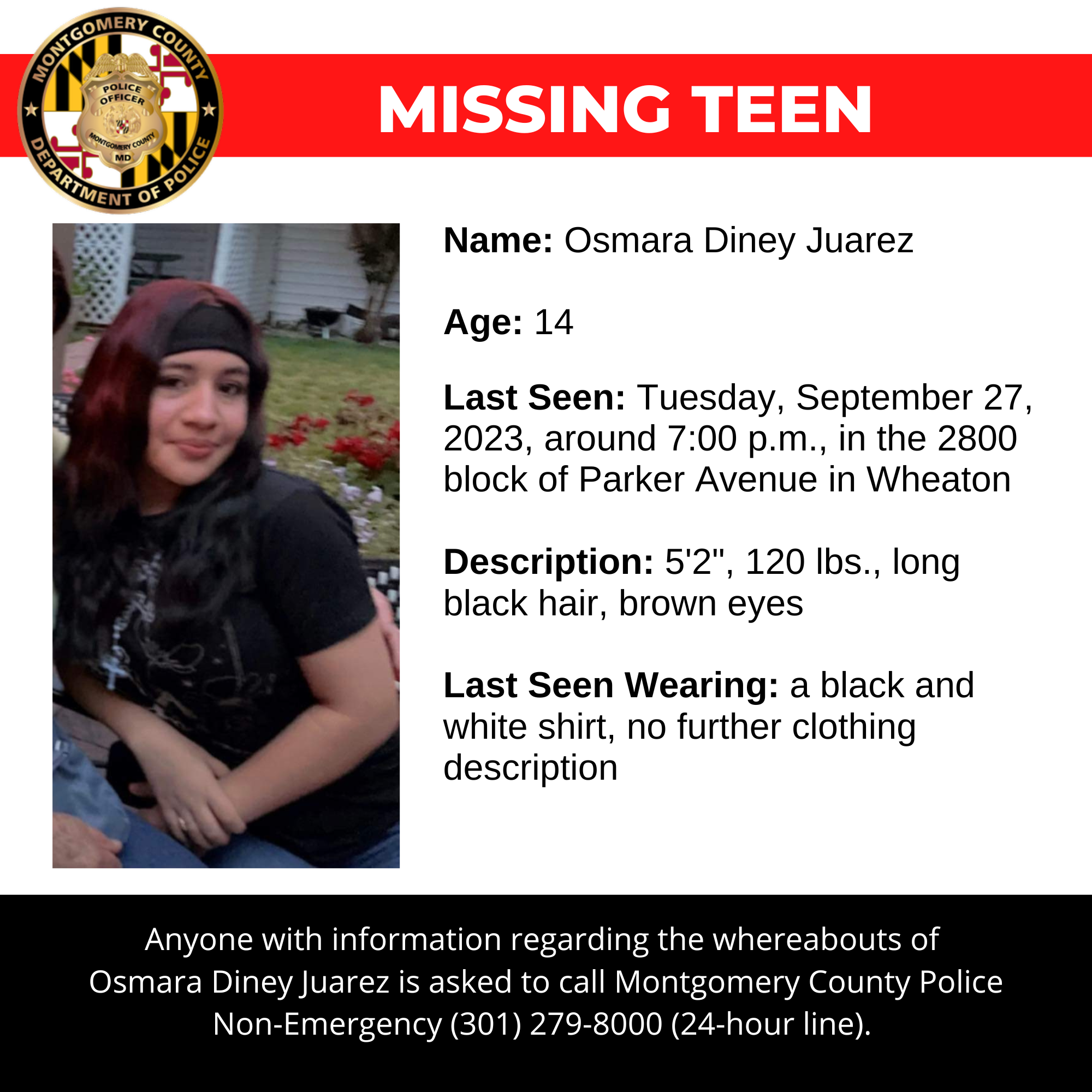 Gaithersburg, MD - Detectives from the Montgomery County Department of Police - Special Victims Investigations Division (SVID) are asking for the public's assistance in locating Osmara Diney Juarez, a missing 14-year-old.
