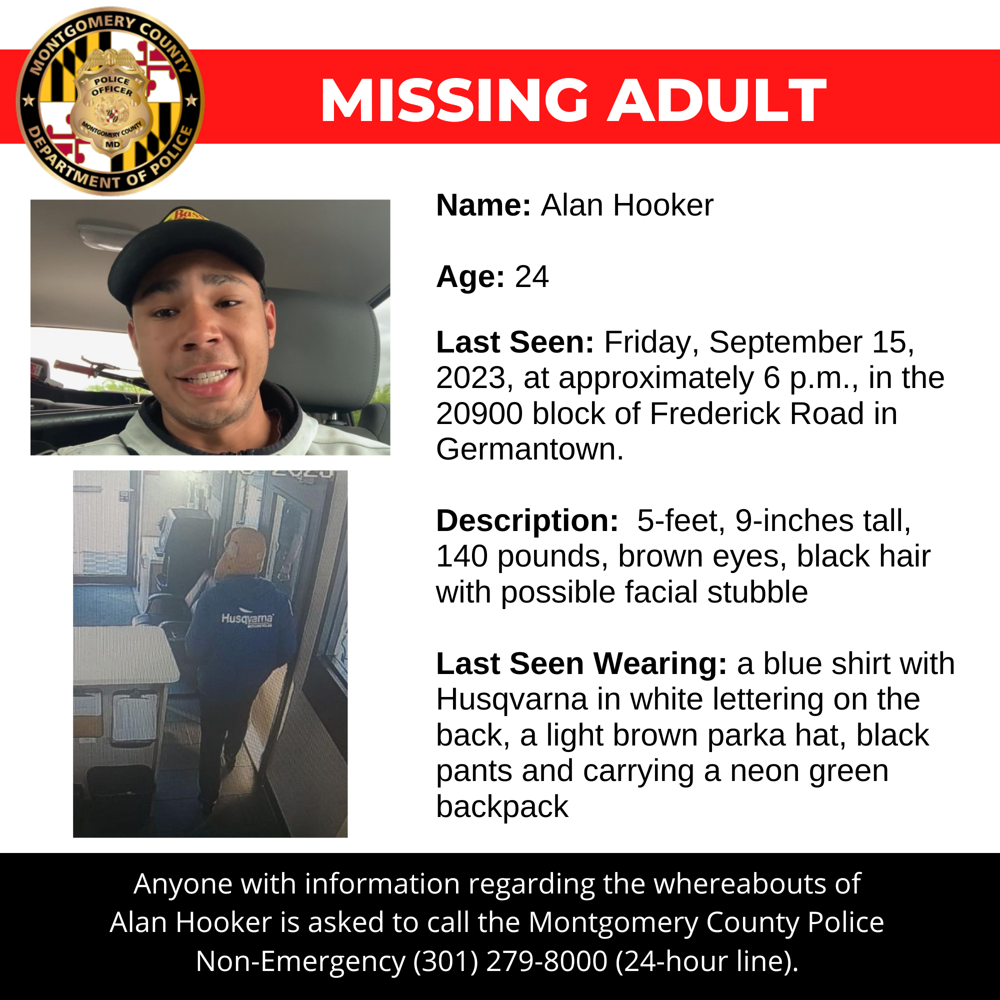 Gaithersburg, MD - The Montgomery County Department of Police - 5th District Investigative Section is asking for the public's assistance in locating Alan Hooker, a missing 24-year-old.