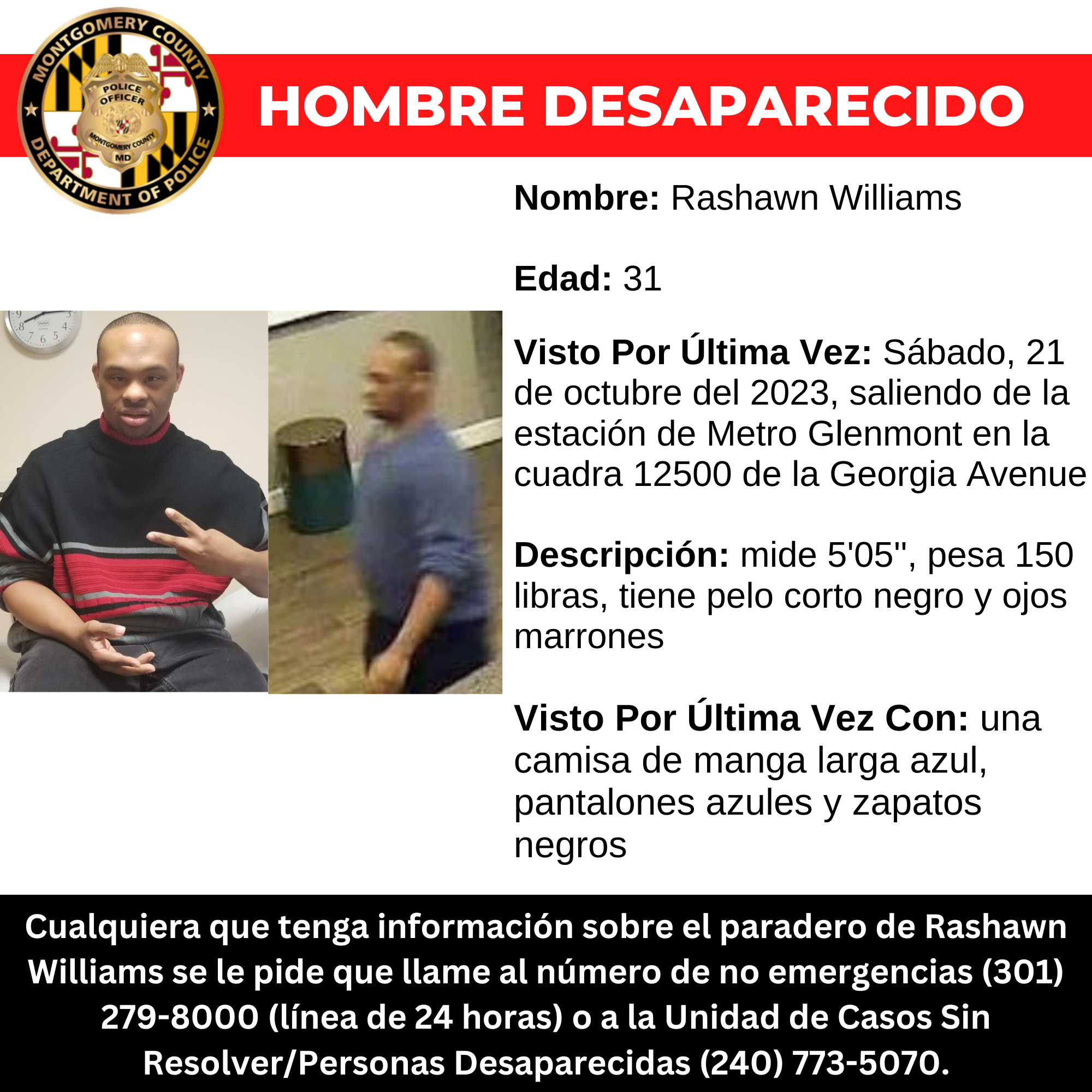 Gaithersburg, MD - El Departamento de Policía del Condado de Montgomery - Unidad de Personas Desaparecidas/Casos Sin Resolver continúa solicitando la ayuda del público para localizar a Rashawn Williams, un hombre no verbal de 31 años. Williams fue visto por última vez el sábado, 21 de octubre de 2023, saliendo de la estación de Metro Glenmont en la cuadra 12500 de Georgia Avenue.