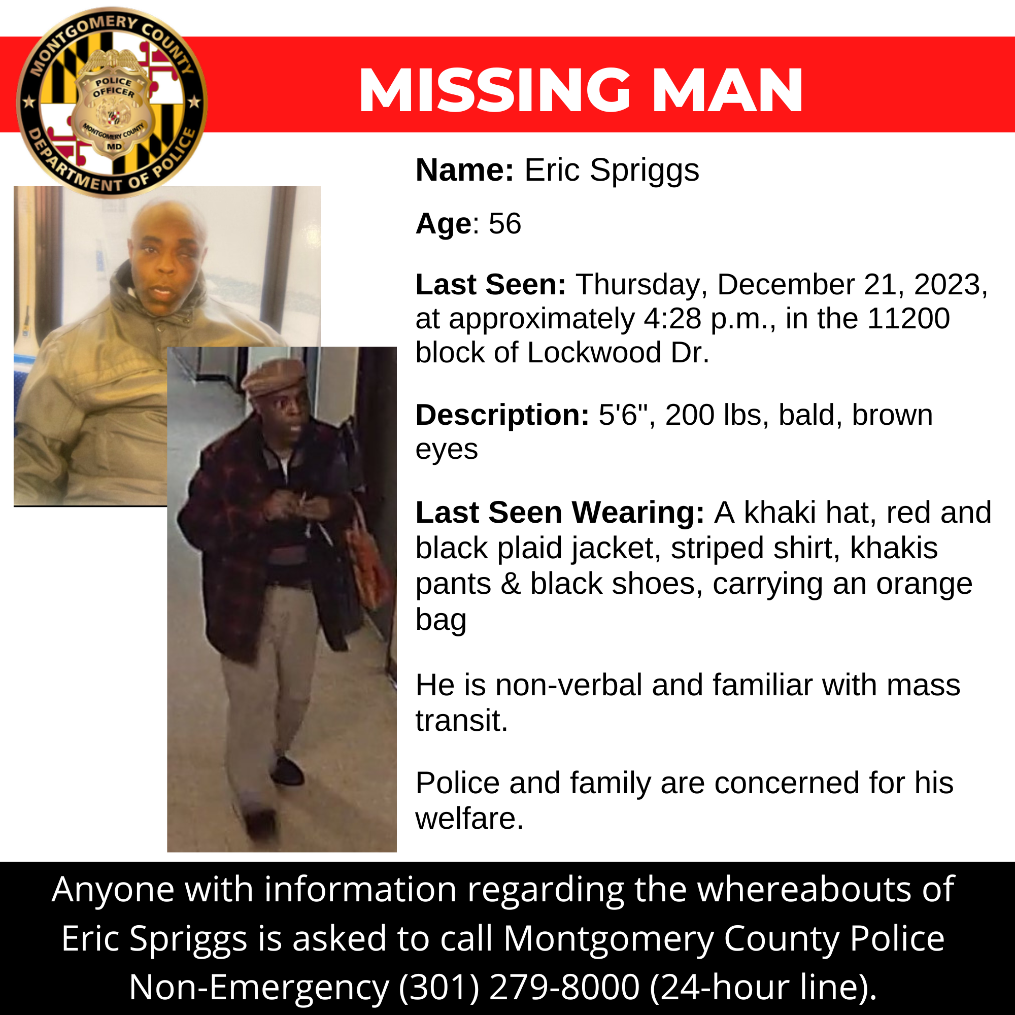Gaithersburg, MD - Detectives from the Montgomery County Department of Police - 3rd District Investigative Section are asking for the public's assistance in locating Eric Spriggs, a missing 56-year-old from Silver Spring. Police and family are concerned for his welfare.