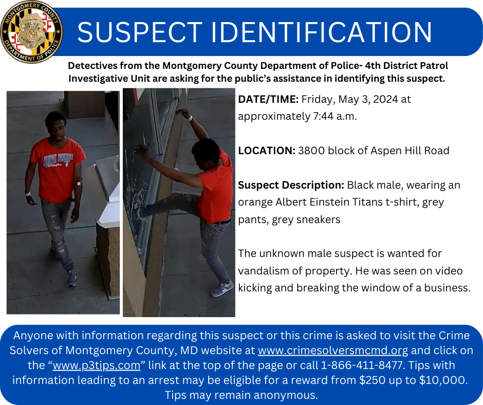 Anyone with information regarding this suspect or this crime is asked to visit the Crime Solvers of Montgomery County, MD website at www.crimesolversmcmd.org and click on the “www.p3tips.com” link at the top of the page or call 1-866-411-8477. Tips with information leading to an arrest may be eligible for a reward from $250 up to $10,000. Tips may remain anonymous.