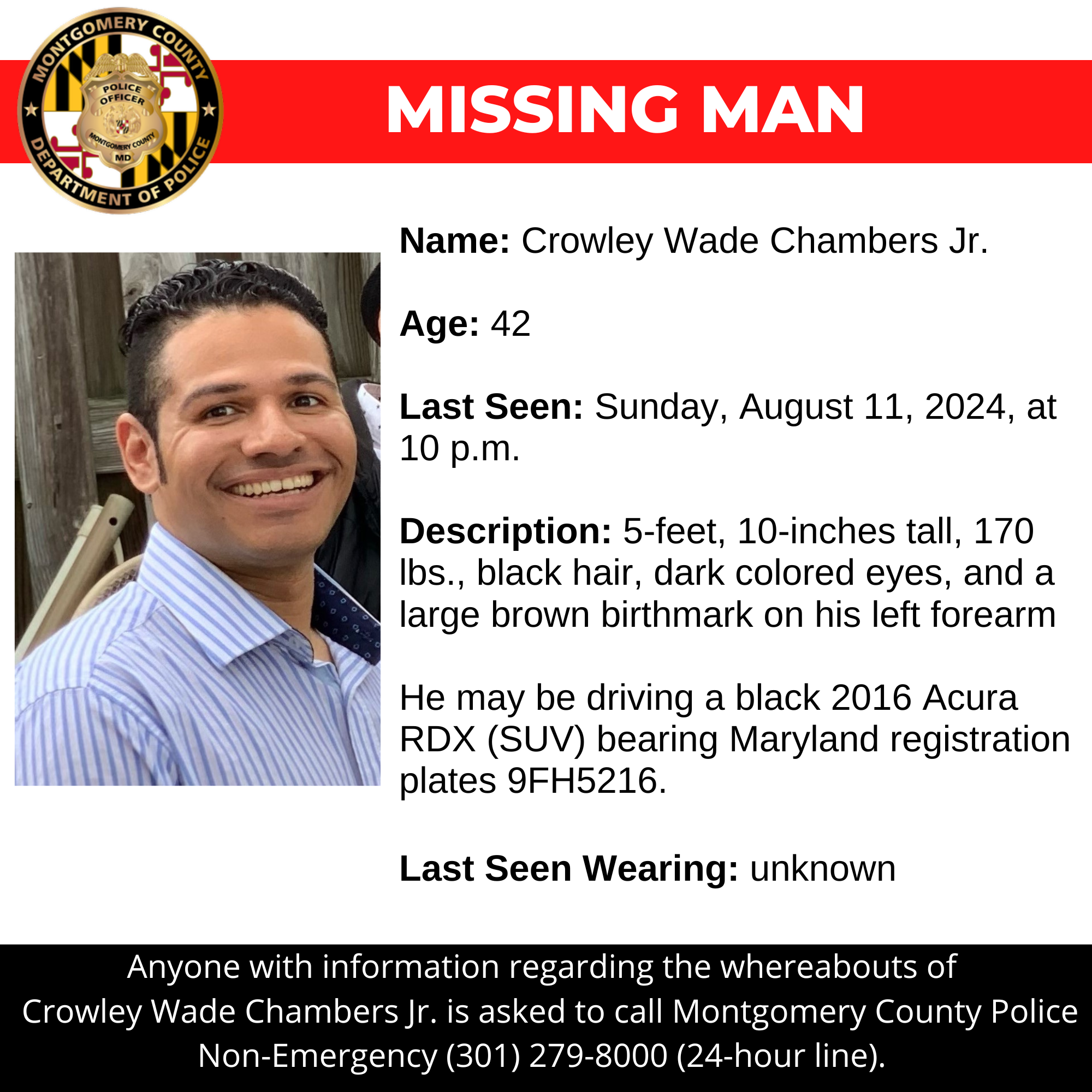 Gaithersburg, MD - Detectives from the Montgomery County Department of Police – 5th District Investigative Section are asking for the public's assistance in locating Crowley Wade Chambers Jr., a missing 42-year-old.