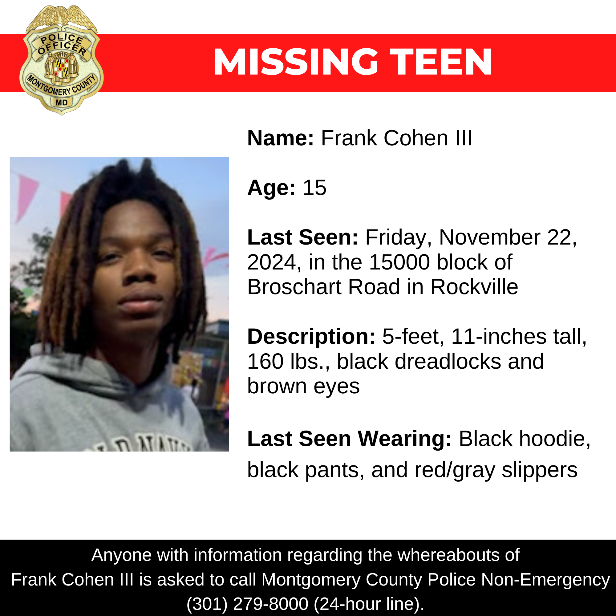 Gaithersburg, MD - Detectives from the Montgomery County Department of Police - Special Victims Investigations Division (SVID) are asking for the public's assistance in locating Frank Cohen III, a missing 15-year-old.