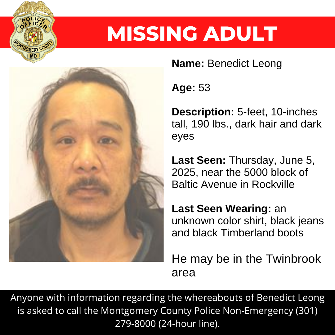 Gaithersburg, MD - Detectives from the Montgomery County Department of Police – Cold Case and Missing Persons Unit are asking for the public's assistance in locating Benedict Leong, a missing 53-year-old.