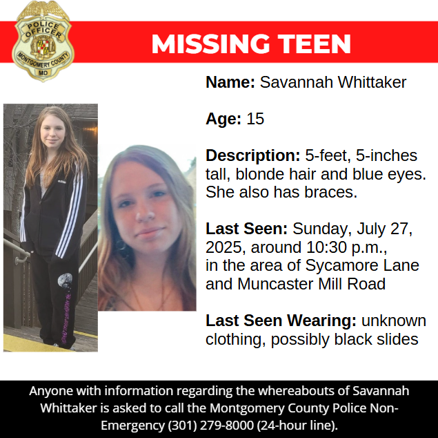 Gaithersburg, MD - Detectives from the Montgomery County Department of Police – Special Victims Investigations Division are asking for the public’s assistance in locating Savannah Whittaker, a missing 15-year-old.