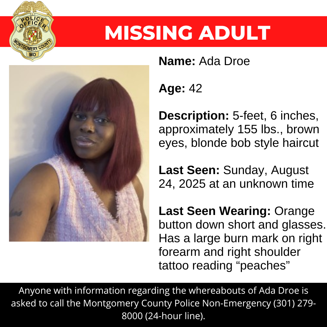 Gaithersburg, MD - Detectives from the Montgomery County Department of Police - 5th District Investigative Section are asking for the public's assistance in locating Ada Droe, a missing 42-year-old.