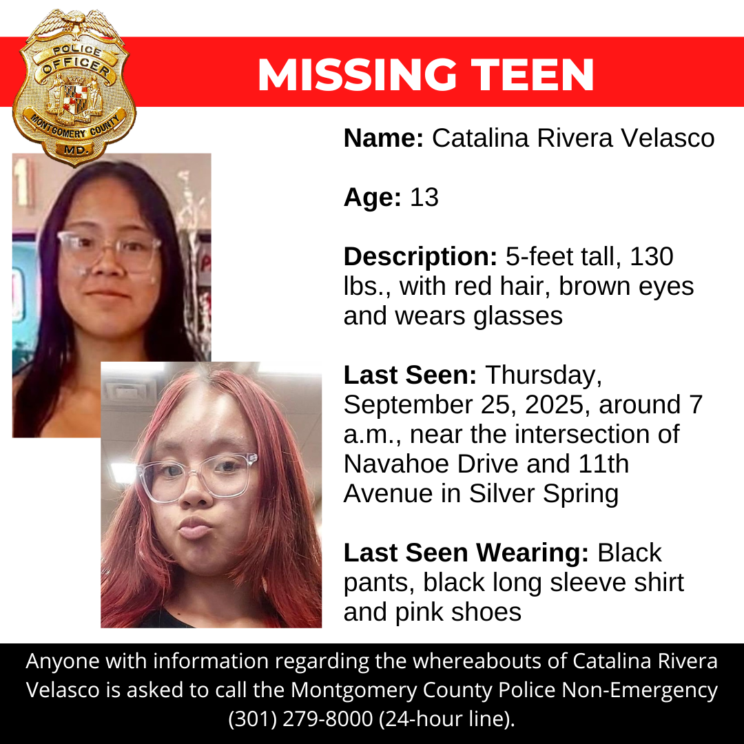 Gaithersburg, MD - Detectives from the Montgomery County Department of Police – Special Victims Investigations Division are asking for the public’s assistance in locating Catalina Rivera Velasco, a missing 13-year-old.