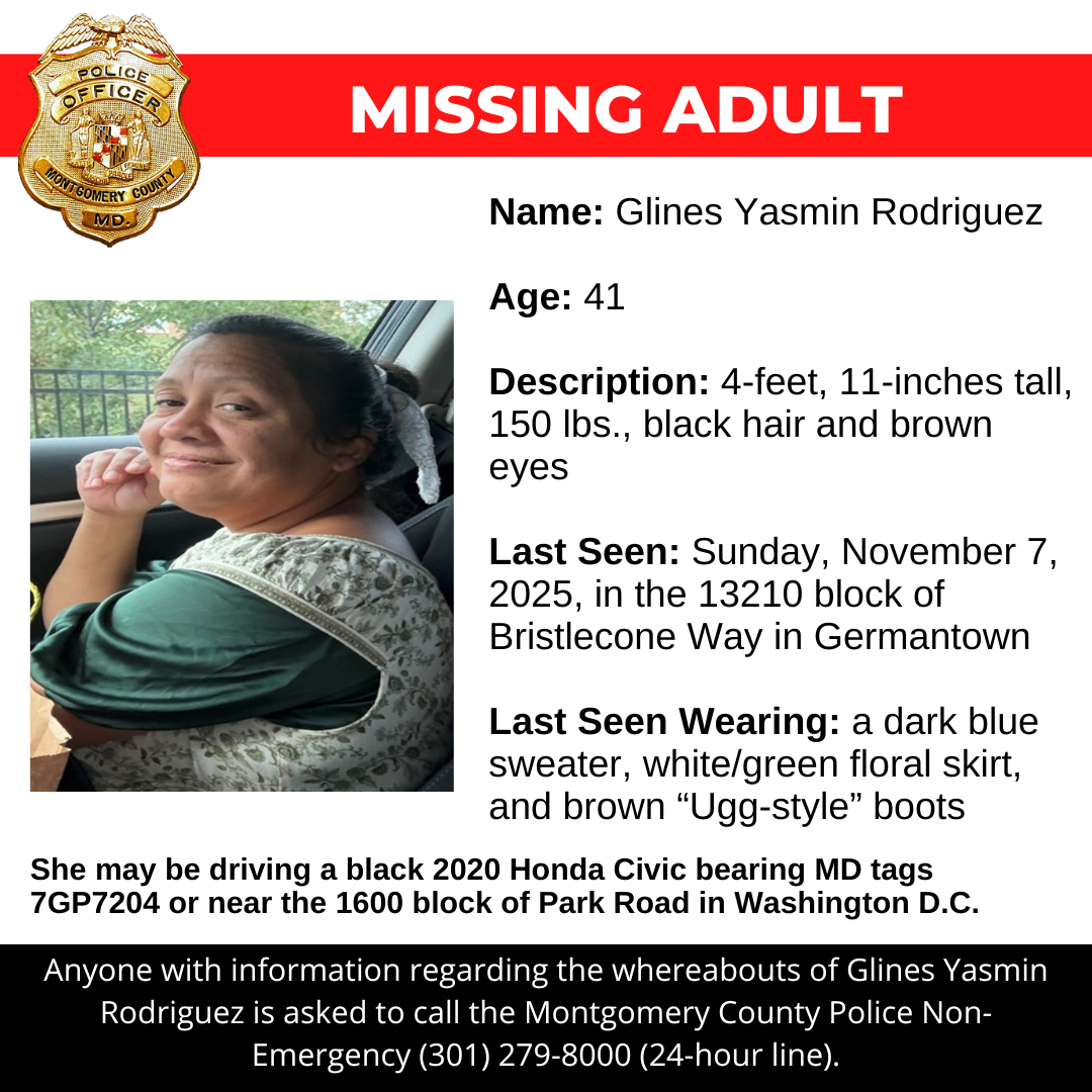 Gaithersburg, MD - Detectives from the Montgomery County Department of Police – 5th District Investigative Section are asking for the public’s assistance in locating Glines Yasmin Rodriguez, a missing 41-year-old.