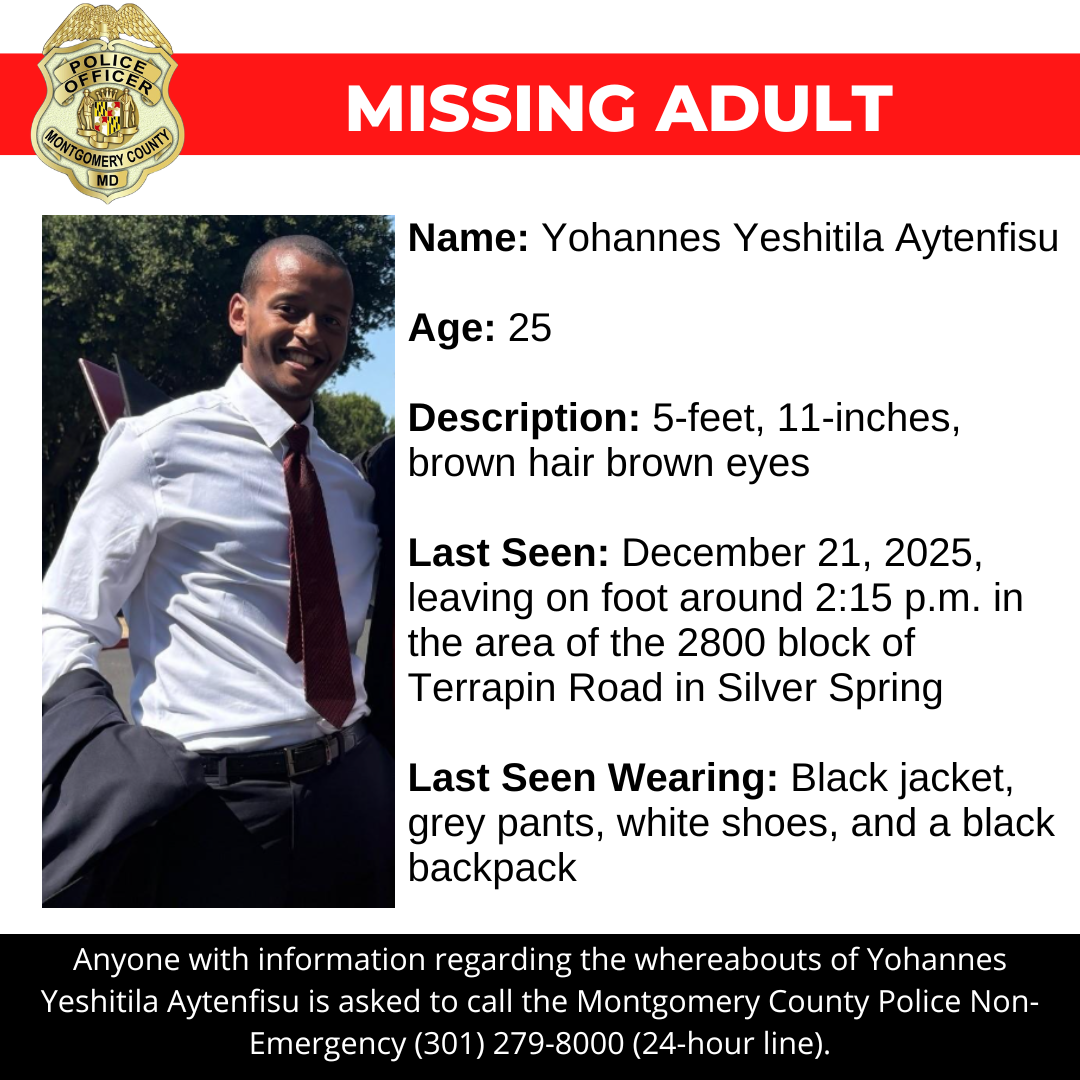 Gaithersburg, MD - Detectives from the Montgomery County Department of Police – 4th District Investigative Section are asking for the public’s assistance in locating Yohannes Yeshitila Aytenfisu, a missing 25-year-old.