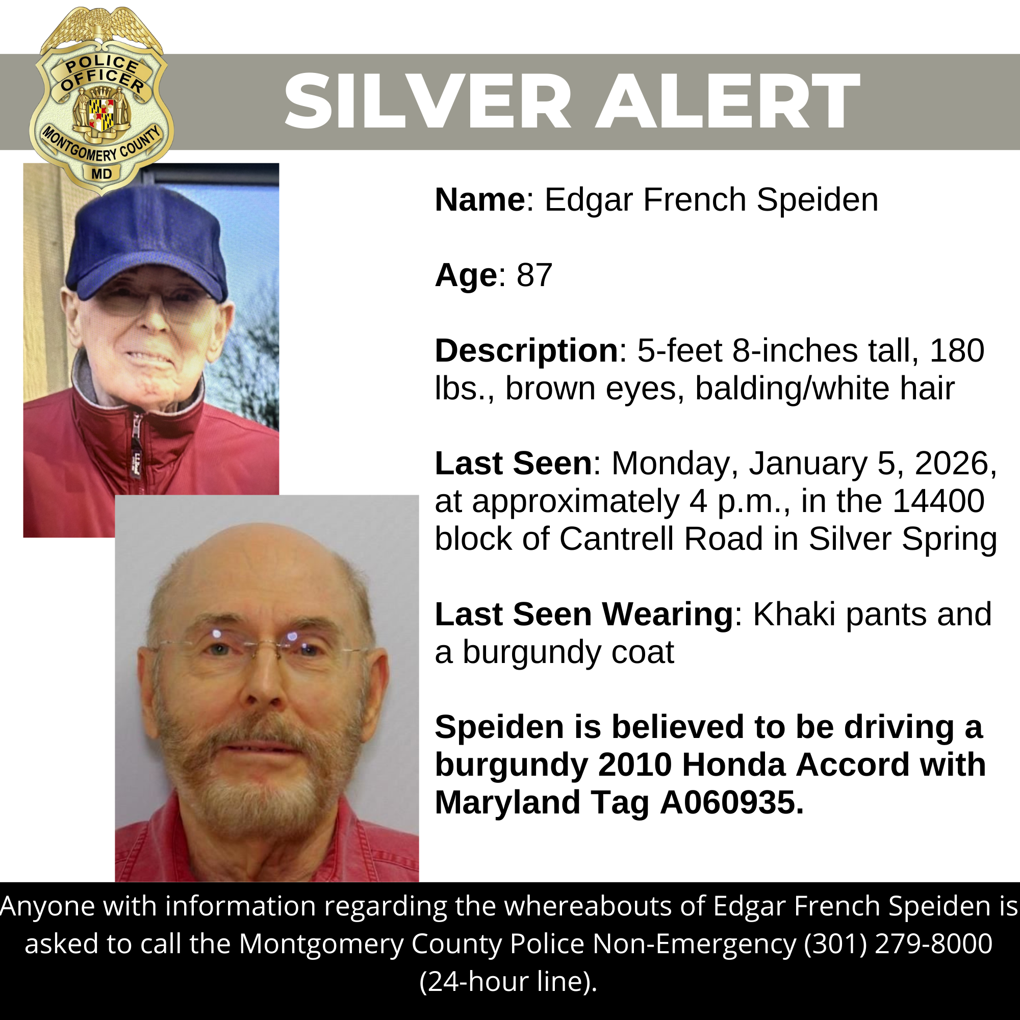 Gaithersburg, MD - Detectives from the Montgomery County Department of Police – 4th District Investigative Section are asking for the public’s assistance in locating Edgar French Speiden, a missing 87-year-old from Silver Spring.