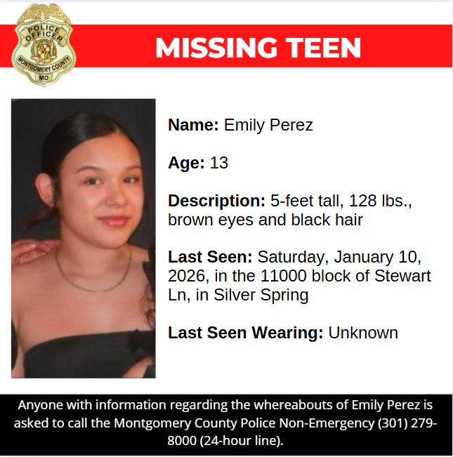 Gaithersburg, MD - Detectives from the Montgomery County Department of Police – Special Victims Investigations Division are asking for the public’s assistance in locating Emily Perez, a missing 13-year-old from Silver Spring.