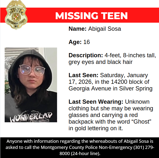 Gaithersburg, MD - Detectives from the Montgomery County Department of Police – Special Victims Investigations Division are asking for the public’s assistance in locating Abigail Sosa, a missing 16-year-old from Silver Spring.