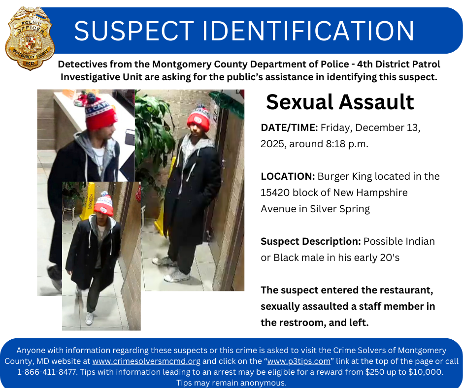Anyone with information regarding this suspect or this crime is asked to visit the Crime Solvers of Montgomery County, MD website at www.crimesolversmcmd.org and click on the “www.p3tips.com” link at the top of the page or call 1-866-411-8477. Tips with information leading to an arrest may be eligible for a reward from $250 up to $10,000. Tips may remain anonymous.