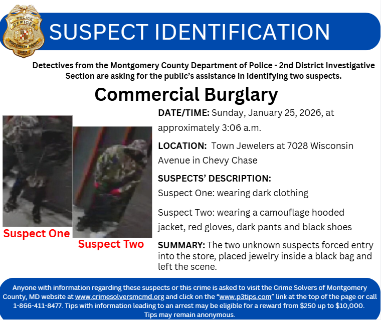 Anyone with information regarding these suspects or this crime is asked to visit the Crime Solvers of Montgomery County, MD website at www.crimesolversmcmd.org and click on the “www.p3tips.com” link at the top of the page or call 1-866-411-8477. Tips with information leading to an arrest may be eligible for a reward from $250 up to $10,000. Tips may remain anonymous.