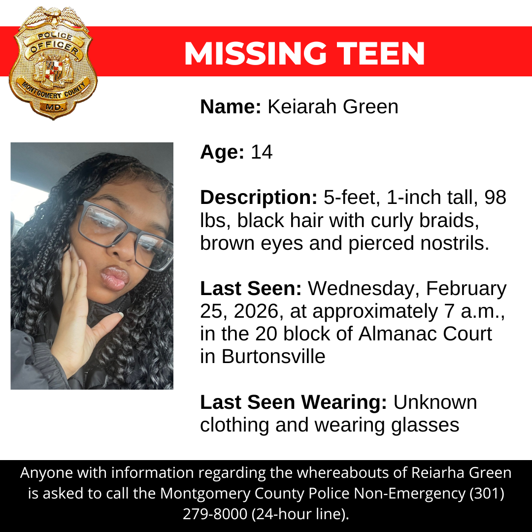 Gaithersburg, MD - Detectives from the Montgomery County Department of Police – Special Victims Investigations Division are asking for the public’s assistance in locating Keiarah Green, a missing 14-year-old.
