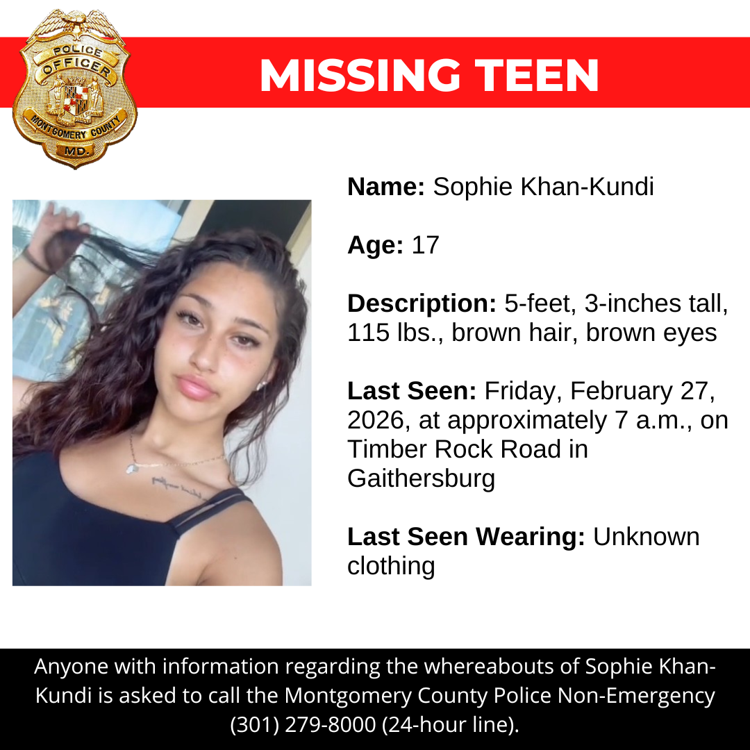 Gaithersburg, MD - Detectives from the Montgomery County Department of Police – Special Victims Investigations Division are asking for the public’s assistance in locating Sophie Khan-Kundi, a missing 17-year-old from Gaithersburg.