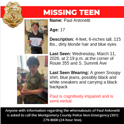 Gaithersburg, MD - Detectives from the Montgomery County Department of Police – Special Victims Investigations Division are asking for the public’s assistance in locating Paul Antonetti, a missing 17-year-old from Gaithersburg.