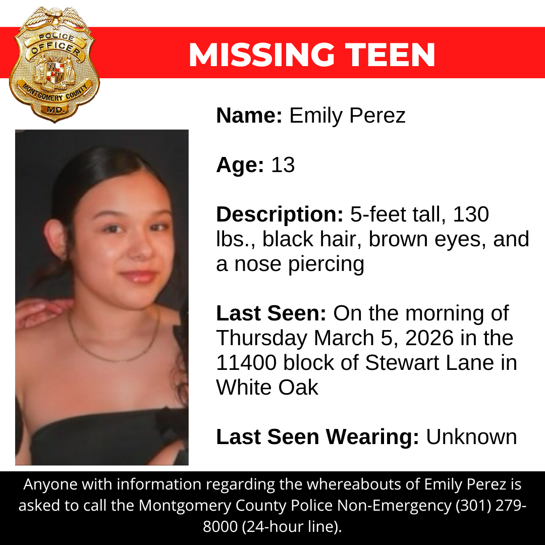 Gaithersburg, MD - Detectives from the Montgomery County Department of Police – Special Victims Investigations Division are asking for the public’s assistance in locating Emily Perez, a missing 13-year-old.