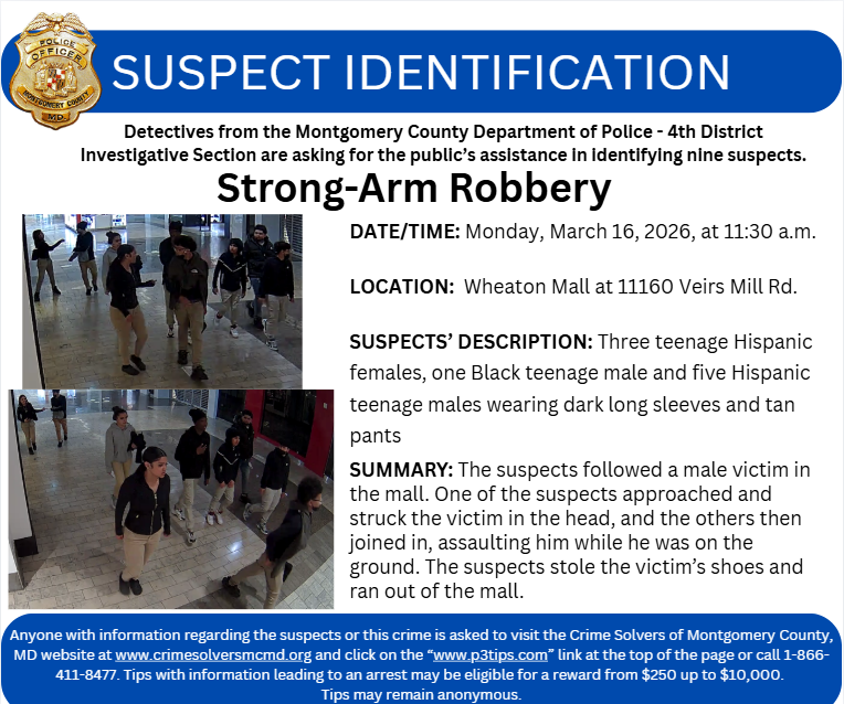 Anyone with information regarding the suspects or this crime is asked to visit the Crime Solvers of Montgomery County, MD website at www.crimesolversmcmd.org and click on the “www.p3tips.com” link at the top of the page or call 1-866-411-8477. A reward of up to $10,000 is being offered for information that leads to the arrest of the suspects. Tips may remain anonymous.