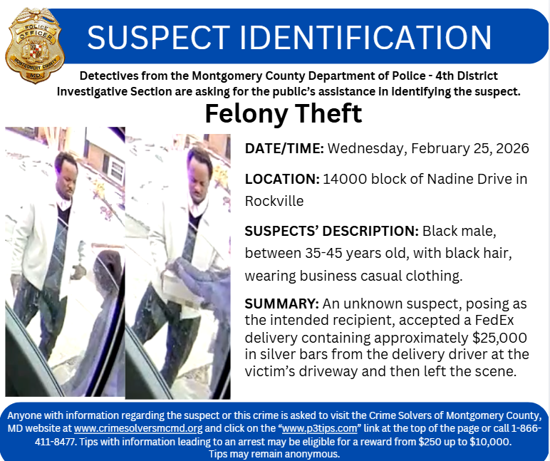 Anyone with information regarding the suspect or crime is asked to visit the Crime Solvers of Montgomery County website at www.crimesolversmcmd.org and click on the “P3 Tips” link at the top of the page or call 1-866-411-8477. Tips may remain anonymous. Information leading to an arrest may be eligible for a reward ranging from $250 to $10,000.