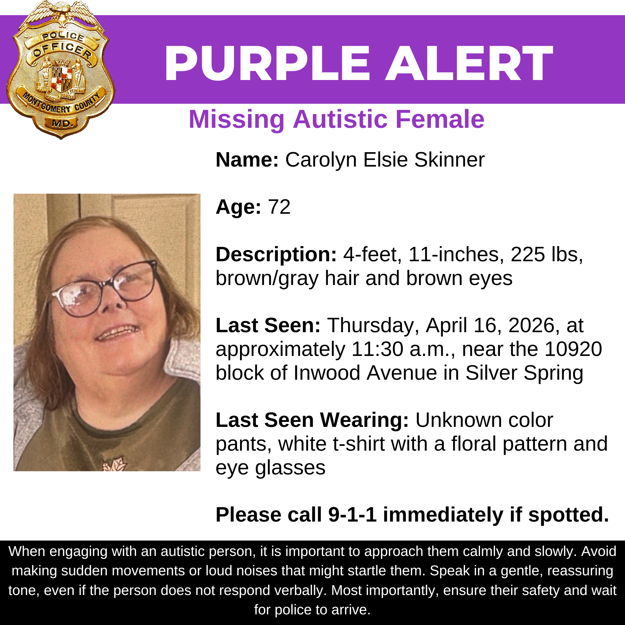 Gaithersburg, MD - Detectives from the Montgomery County Department of Police – 4th District Investigations Division are asking for the public’s assistance in locating Carolyn Elsie Skinner, a missing 72-year-old.